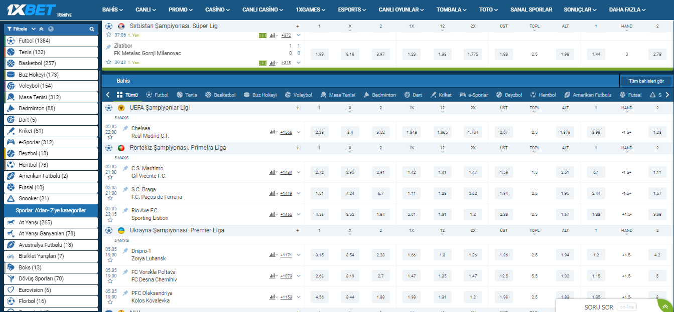 Bahis şirketi canlı yayın, maç öncesi ve canlı bahislerde çok sayıda bahis sunuyor. Bahis sayısı, oranlar etkinlik kategorisine bağlıdır.