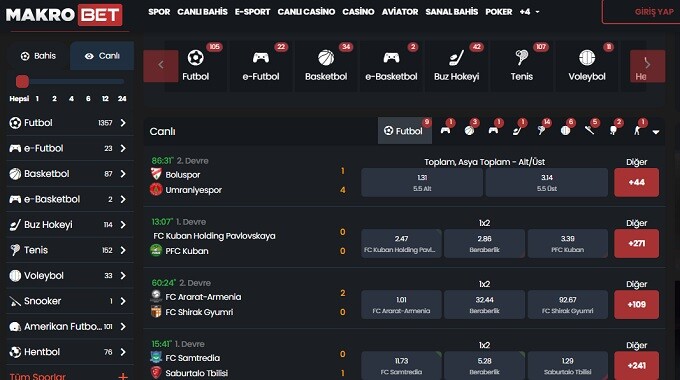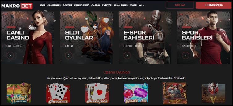 Makrobet sistemine giriş, kullanıcıya sunulan tekliflerin sunulduğu ana sayfanın ziyaret edilmesiyle başlar. Spor bahisleri ve canlı bahisler ilk iki sekmeye entegre edilmiştir. Curaçao lisansı sayesinde oyuncular kazino ve canlı kazinolardaki oyunların kalitesini değerlendirebilir.
