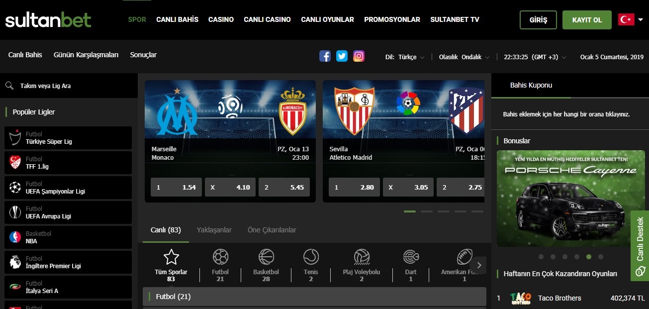 Spor bahisleri bölümü, yaklaşan etkinlikler ve oranlar hakkında ayrıntılı bilgiler içerir. Canlı olarak, Sultanbet en yüksek oranları sunar.